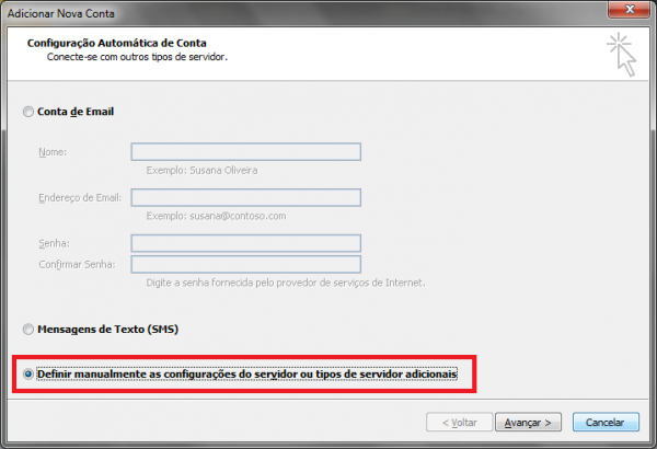 Marque a opção Definir manualmente as configurações do servidor ou tipos de servidor adicionais e clique no botão Avançar.