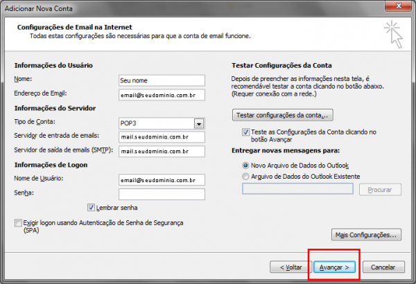 - Servidor de saída de emails (SMTP): digite mail.seudomínio.